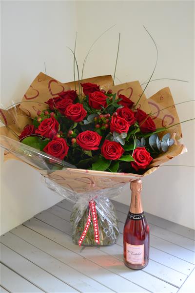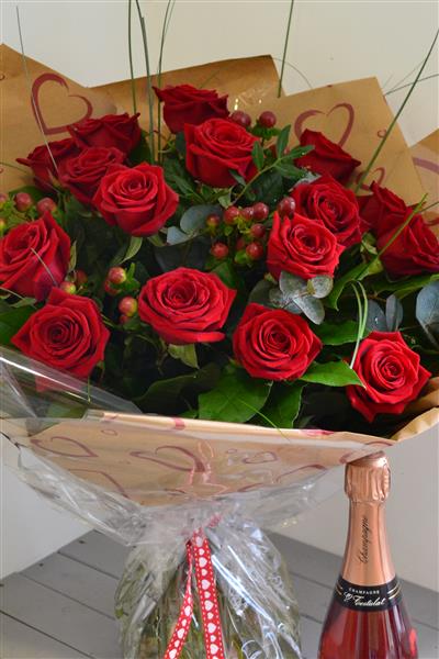 Featuring 18 large headed red naomi roses hand-tied and gift wrapped with ribbon and presented in gift packaging plus a bottle of Rose Testulet champagne.