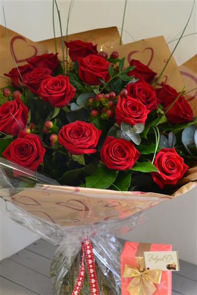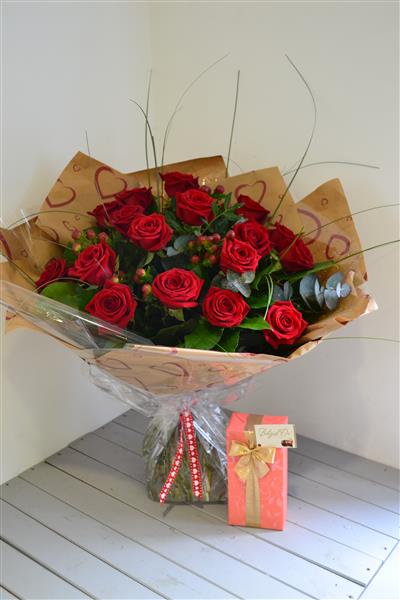 Featuring 18 large headed red Naomi roses hand-tied and gift wrapped with ribbon and presented in gift packaging, plus we've added a box of luxury 175g Belgian chocolates as well.