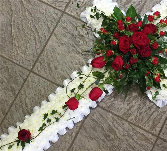 A striking combination of red large-headed roses, and spray rose is set off by a white chrysanthemum base with a pleated white ribbon edging. Cross is 4' as pictured.