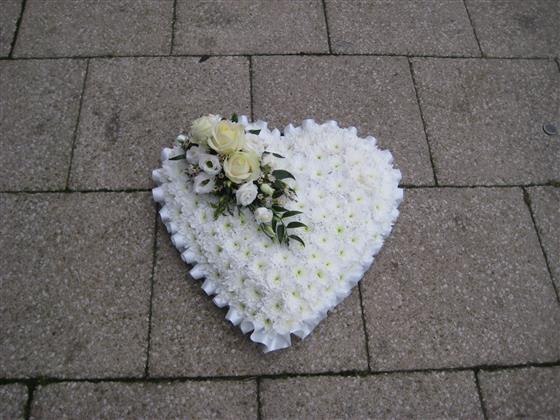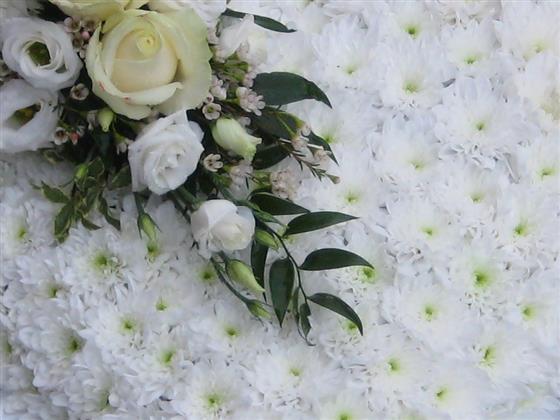 A very delicate design of all white flowers with a chrysanthemum base, white ribbon edging and white large headed roses in the spray. Size shown is on 17 inch frame, finished design measures approx 19 inch.