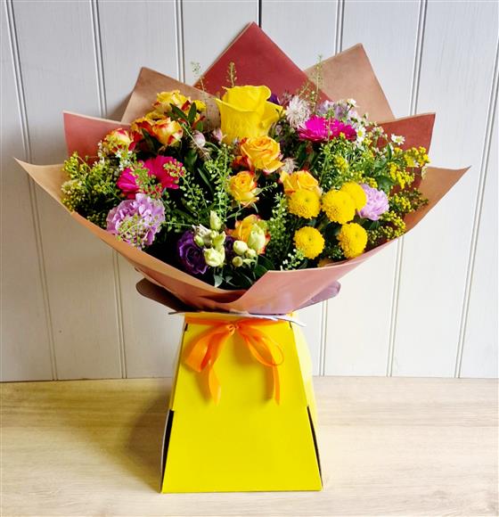 Glow with warmth and colour with our Amber Radiance hand-tied. This stunning arrangement captures the essence of sunshine and joy with golden yellow roses, rich amber tones and vibrant accents of pink and purple.