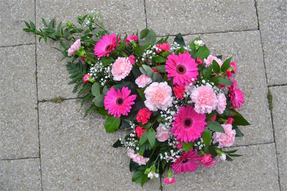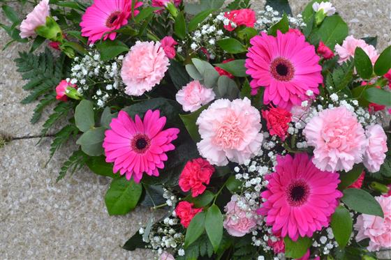 Large pink gerbera and carnations are the focal flowers in this striking pink single ended spray. Complemented with spray carnations and white gypsophilia and green foliage. Photo depicts medium size.