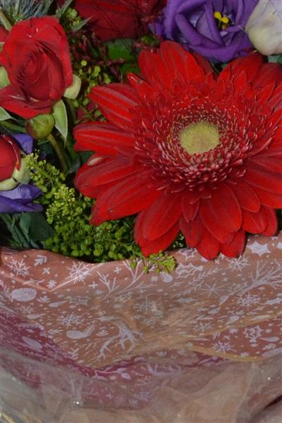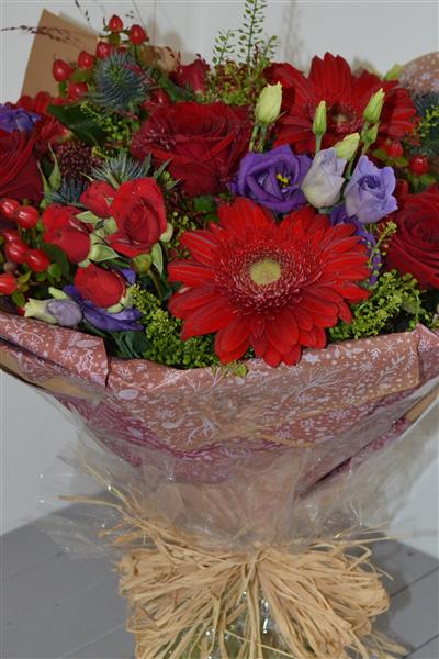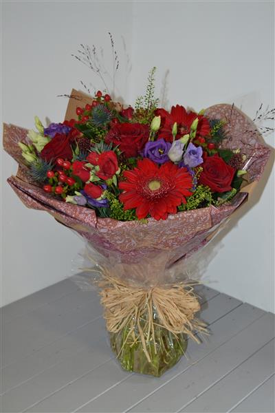 Our Christmas Ruby Handtied Bouquet is a range of red and purple flowers including large head red roses, with seasonal foliage. Presented in a water bubble and gift bag. Photo depicts Standard size.