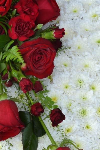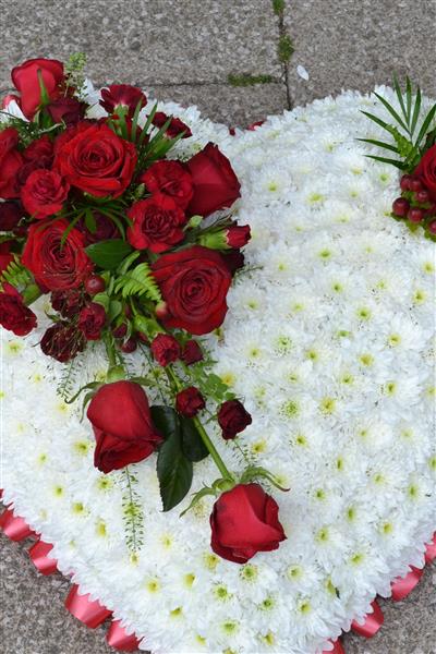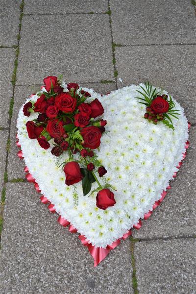 A classic heart-shaped design, edged in red ribbon covered with a mass of white double spray chysanthemum and finished with a spray of red large-headed roses. Size shown is on a 17 inch frame, approx 17 inch across at its widest point.