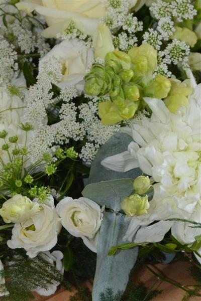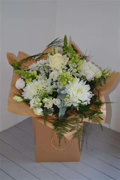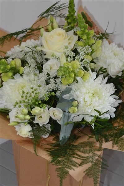 A classic white and green hand tied bouquet with white large roses, long lasting chrysanthemum blooms, antiirhnum, lisianthus and ammi visnaga. Photo depicts standard size