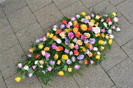A selection of gorgeous roses in mixed colours is beautifully complemented by an array of luxurious deep green leaves to create this striking casket spray. Approximate length 153cm (5ft).