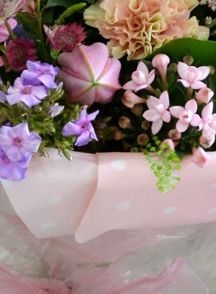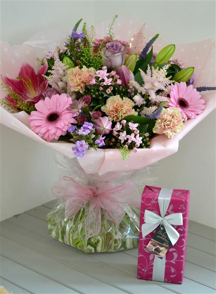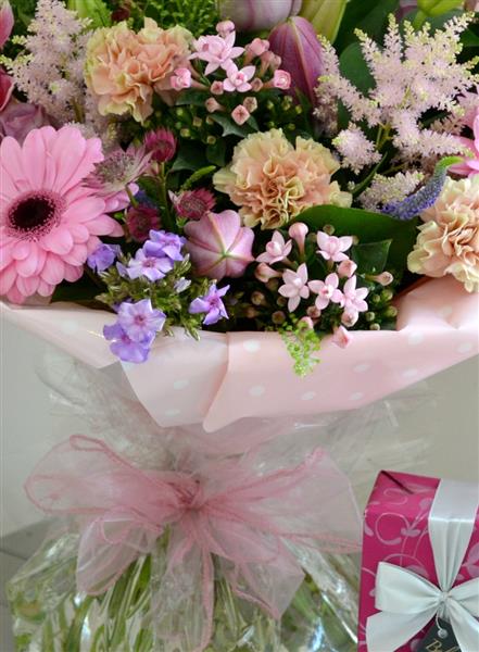 One of our most popular hand tieds, this is a lovely seasonal selection of country style, meadow flowers in delicate shades of peach, lilac and pink including gerberas, large headed roses and scented lilies. Arranged in a hand tied bouquet, it is ready for instant display and is already to go straight into a vase once unwrapped. We've added a 175gm box of luxury chocolates as well! Photo depicts the large size.