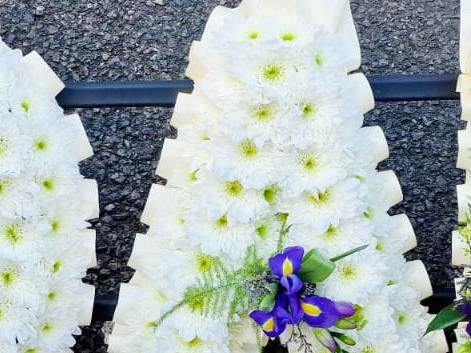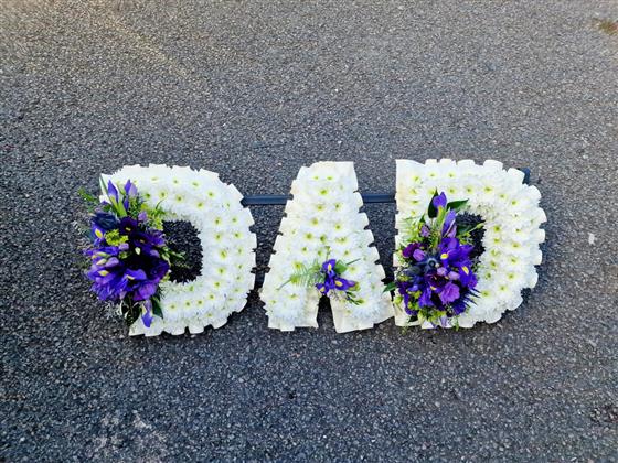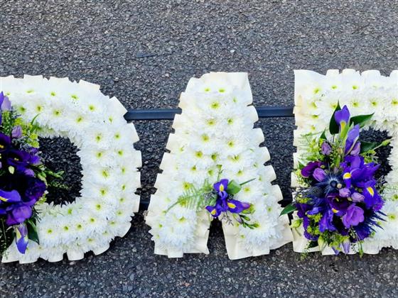 A Dad tribute ribbon edged in cream, accented with clusters of vibrant purple flowers. Adding a touch of color and sophistication. The arrangement is meticulously designed to convey love and remembrance, making it a fitting tribute for honoring a beloved father.