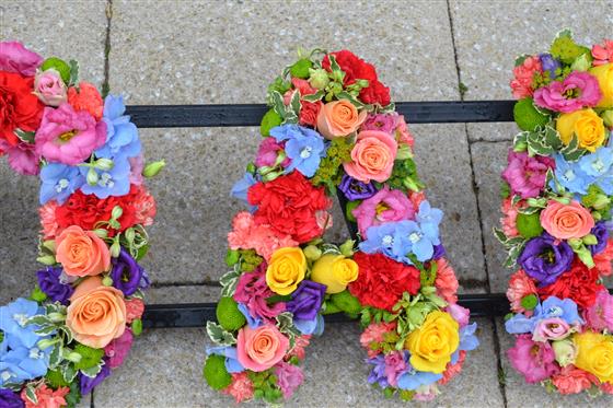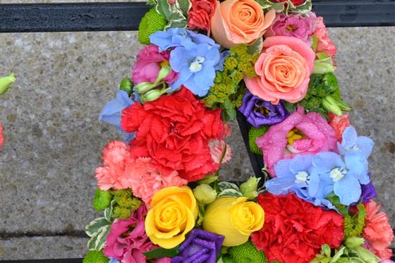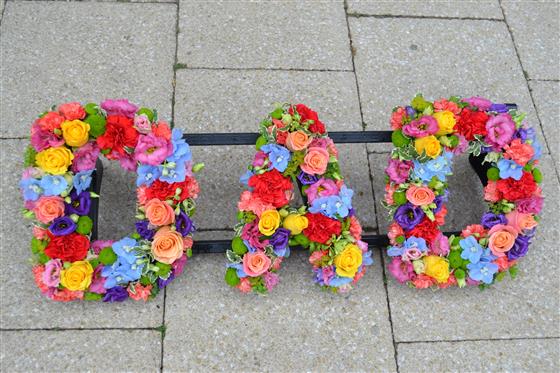 A bright 'DAD; tribute, filled with seasonal flowers in rainbow colours including roses, spray carnations and chrysanthemums. Also available as a MUM, MOM, NAN or any name of your choice.
