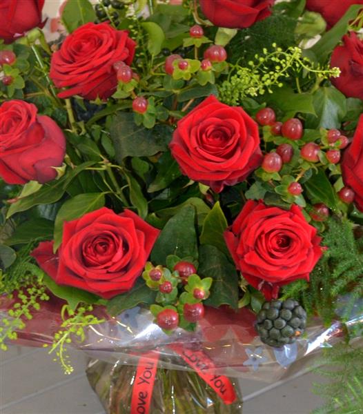 These premium large head Naomi roses are the ultimate in quality and style with their velvety petals, long, elegant stems and the deepest, dramatic shade of red enhanced with hypericum berries and premium foliages. This is a statement bouquet – the perfect choice if you’re keen to make a lasting impression for your romantic occasion.