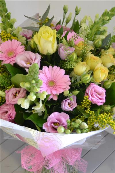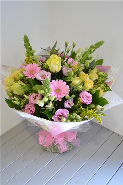 Featuring yellow large headed roses, pink Lisianthus, pale pink gerbera, flowers to tone and with pistache, salal and panicum grass, hand-tied, wrapped and presented in eco gift packaging. Photo depicts medium size.