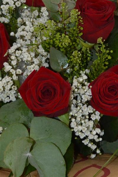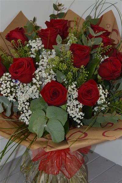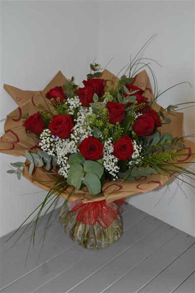 The classic gift of 12 large-headed beautiful red roses hand-tied with gypsophila and seasonal foliages gift wrapped and aqua packed in coordinating eco Kraft and ribbon.
