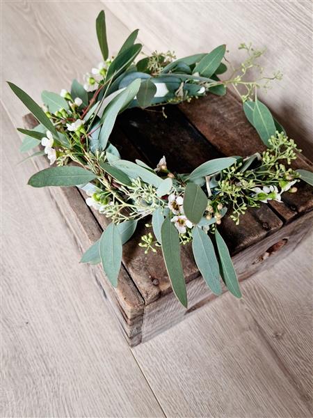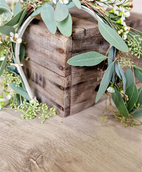 This eucalyptus hair band is a charming and natural accessory, ideal for a bohemian or rustic look. The band features an arrangement of fresh eucalyptus leaves and delicate wax flowers, intertwined with subtle, berry-like buds. The greenery cascades gracefully around the band, creating a lush, organic feel, perfect for weddings, festivals, or special events. The eucalyptus leaves, with their soft green hue and slightly rounded shape, offer a sense of elegance and freshness. The band’s base is discreet allowing the foliage and floral accents to take center stage.