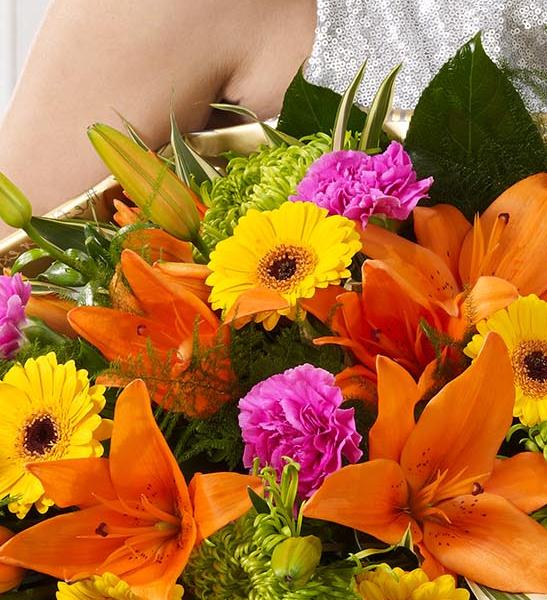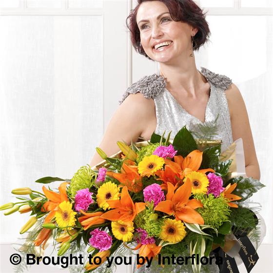 Featuring orange Asiatic lilies, cerise carnations, green chrysanthemums and yellow germini, expertly hand-tied with asparagus fern, aspidistra and aralia leaves, dracaena sandriana and ruscus and finished with gift wrap and ribbon.