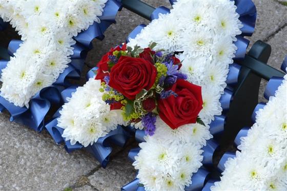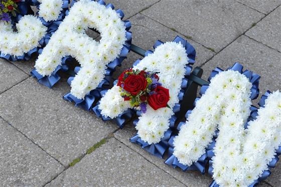 This GRAN name is edged in ribbon trim, based in white chrysanthemums with matching sprays. Available in different ribbon and spray combinations, please ring or email for more information.