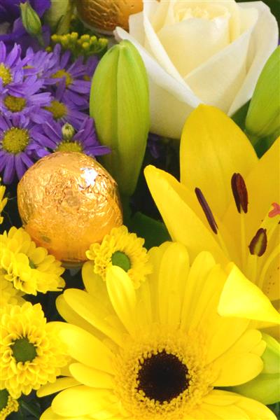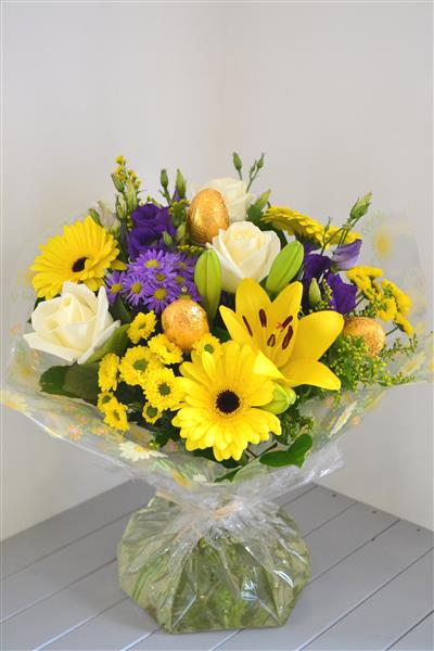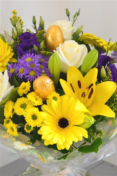 A cheerful Easter hand tied, bursting with flowers which includes large headed cream roses, lily and gerbera in shades of purple, yellow and cream. And, as it's Easter, we've added three chocolate eggs as an extra treat. Photo depicts standard size.