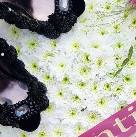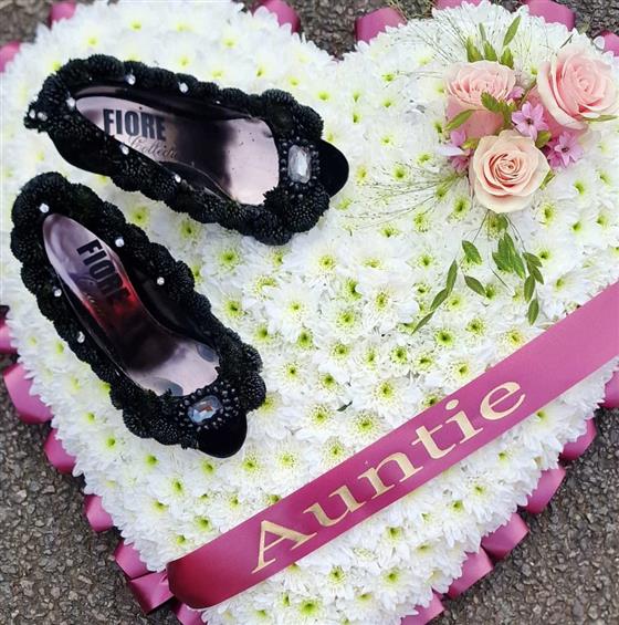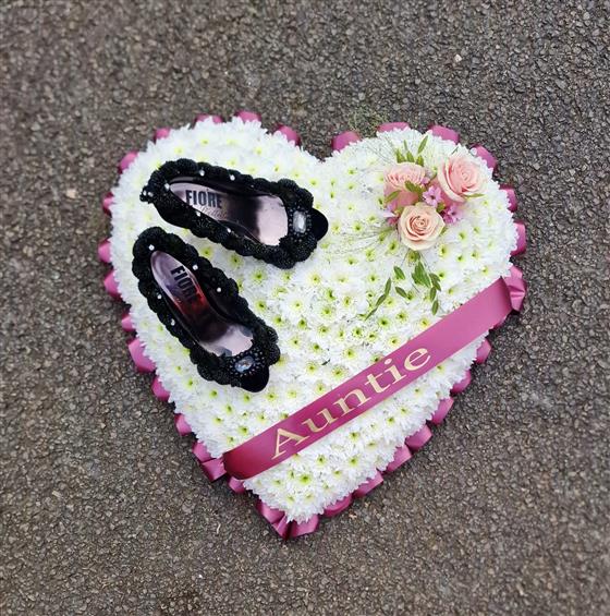 A special tribute for a lady who was known for her high heels. The heart is based in double chrysanthemum with the heels delicately decorated with santini and diamantes.