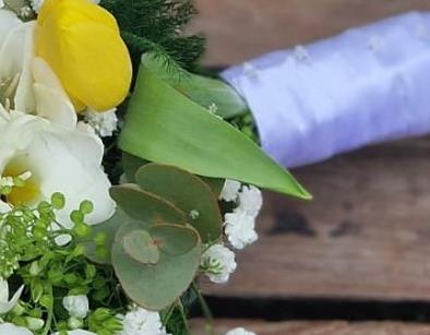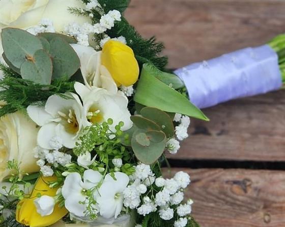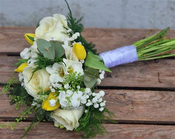 This beautifully arranged posy that radiates a fresh and classic charm through its use of elegant white and yellow flowers. Interspersed among the roses are cheerful yellow tulips, delicate white freesias, clusters of gypsophilia. Sprigs of fresh green eucalyptus add a touch of rustic charm and a gentle fragrance, their round leaves providing a subtle contrast in shape and texture.
