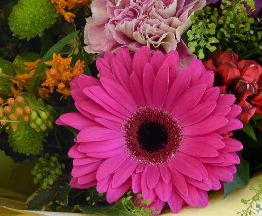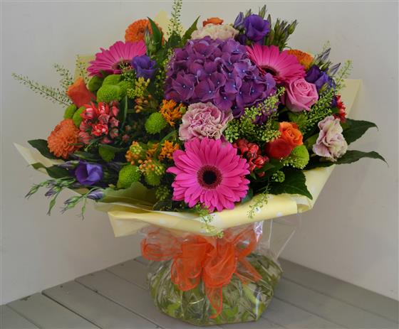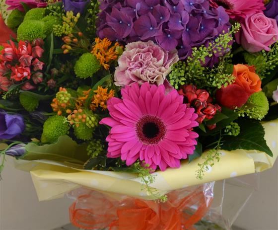 Ready to be popped straight into a vase, this vibrant colourful hand-tied in pink, lime, purple and orange includes gerbera and roses and is sure to brighten anyone's day. Photo depicts standard size.