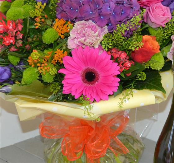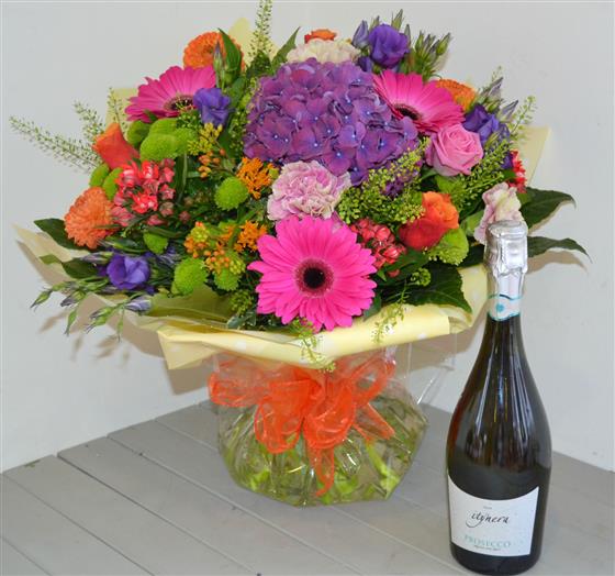 A dazzling colourful hand tied including roses and gerbera arranged in with coordinating cellophane and bow. We've added a bottle of sparkling Prosecco too! Photo depicts standard size.