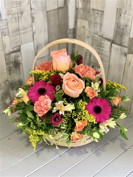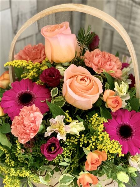 A collection of colourful flowers including roses, gerbera, mini roses, lisianthus, filler flower and foliage arranged in a willow basket.