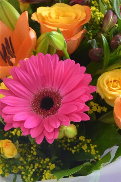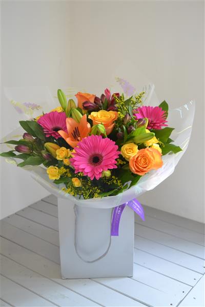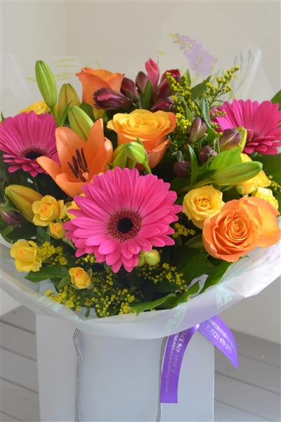 A vibrant collection of roses, lilies, alstromeria, solidaster, gerbera and seasonal foliage. Hand tied and delivered in a 'water bubble'. Photo depicts standard size.
