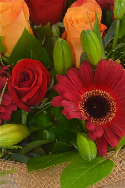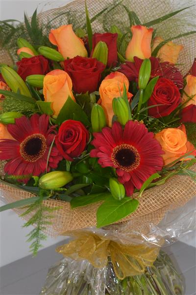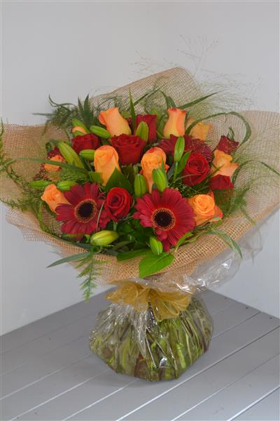 Featuring large-headed Naomi red roses, orange roses, Asiatic lilies, gerberas and salal leaves, expertly hand-tied and presented in luxurious packaging for maximum impact when your gift is delivered.