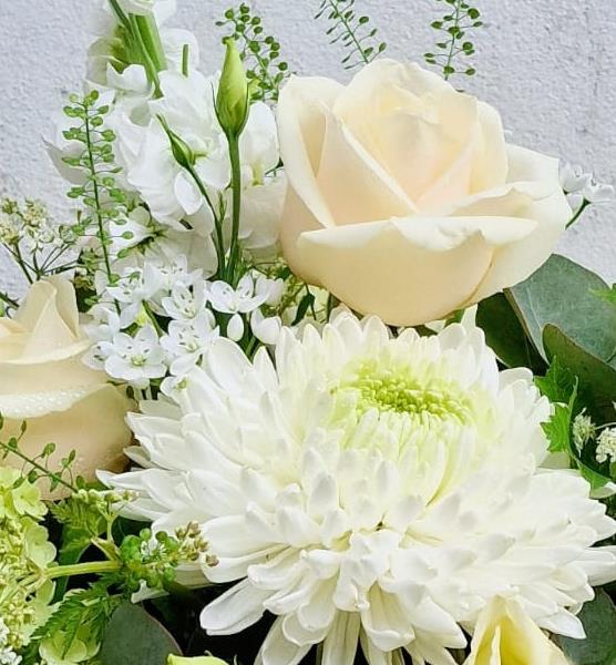 This arrangement is a head turner! This lovely arrangement comes in a ceramic container filled with lush white flowers of stocks, roses, blooms, lisianthus and snap dragon as well as a variety of foliage including eucalyptus.