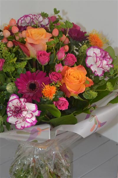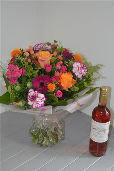 An array of summer flowers including roses and gerbera in rich, vibrant raspberry and orange shades, hand tied by one of our florists and presented in a 'water bubble' for instant display. We advise water bubble is removed within 2 days and the flowers although can remain tied are placed into a vase with flower food. full care instructions and food included. Delivered with a bottle of Rose Wine to complete your gift. Size in photo is standard.