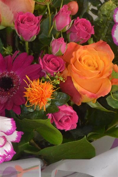 Orange and Raspberry Ripple and Rose Wine Handtied Bouquet zoom 2Orange and Raspberry Ripple and Rose Wine Handtied Bouquet zoom 3