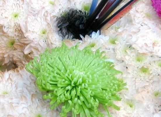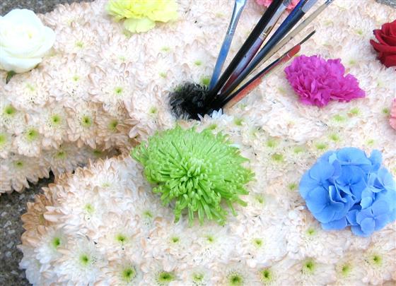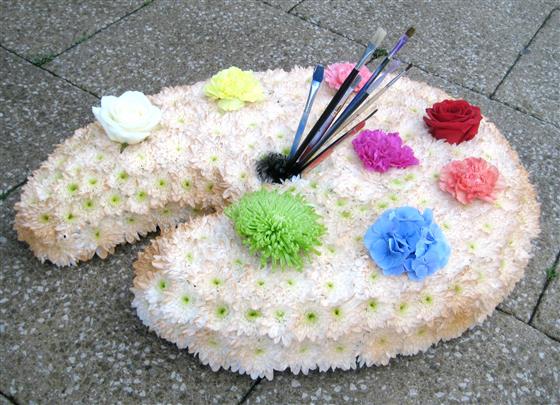 This painters palette has been designed on floral foam, based in white chrysanthemum with fresh flowers adding the touches of colour.