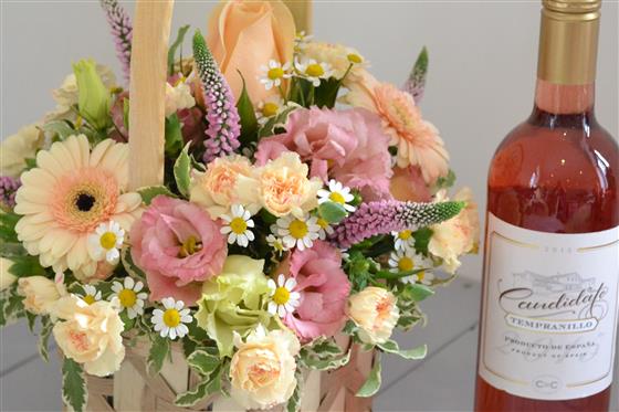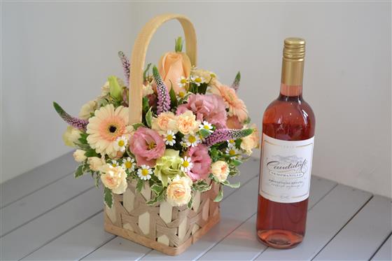 Send a gift that looks delightful and impress someone with your choice. This charming basket is a beautifully arranged selection of delicate pink and peach flowers featuring a large headed rose, spray carnations and pretty seasonal flowers presented in a natural softwood basket. A bottle of rose wine completes this pretty gift.