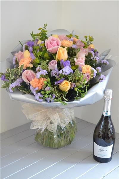 Peach and Lilac Rose and Freesia with Prosecco 1