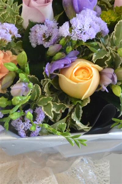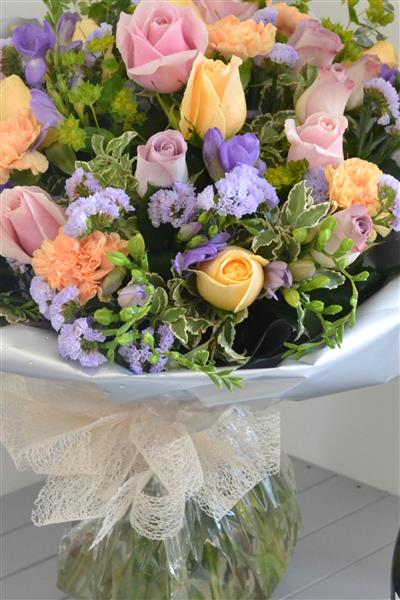 A very pretty, feminine hand tied, perfect for a summer celebration. It includes peach and pink large headed roses, lilac freesia with complementary summer flowers. Arranged ready to be unwrapped and popped straight into a vase, it is delivered in a water bubble with matching cellophane and ribbon. And if it's a very special celebration, why not send it with a bottle of Prosecco! Photo depicts standard size.