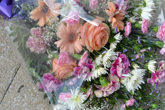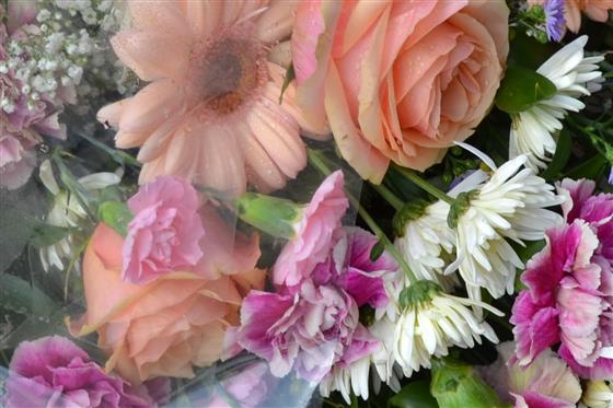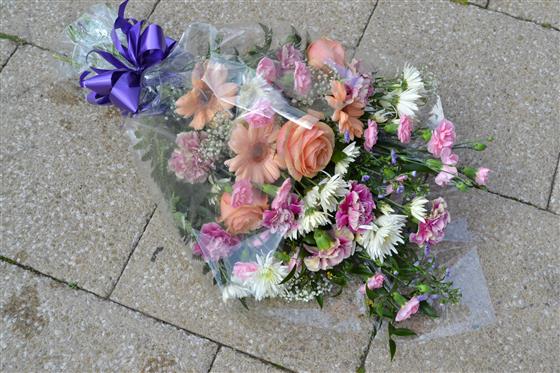 This sheaf in cellophane is a pastel collection of pink and peach flowers and would be particularly suitable for a lady.