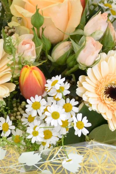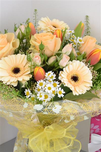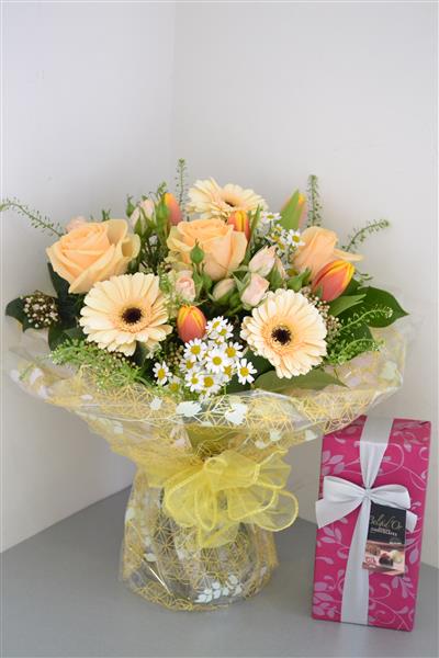 Such a pretty and refreshing design of peach and cream flowers including a large headed peach roses, gerberas and a fresh seasonal selections of flowers all arranged in a clear glass vase wrapped with coordinating cellophane and ribbon. To complete this gift we have added a 175gm box of luxury Belgian chocolates.