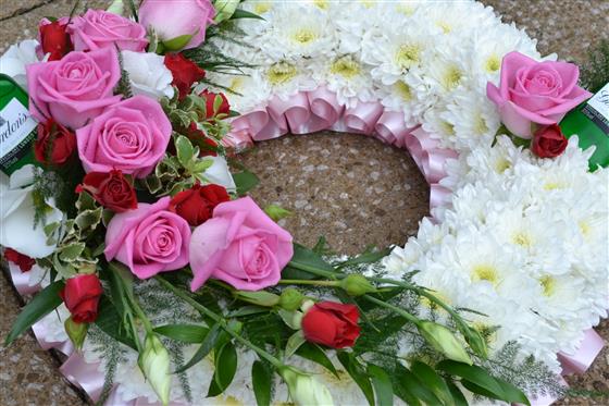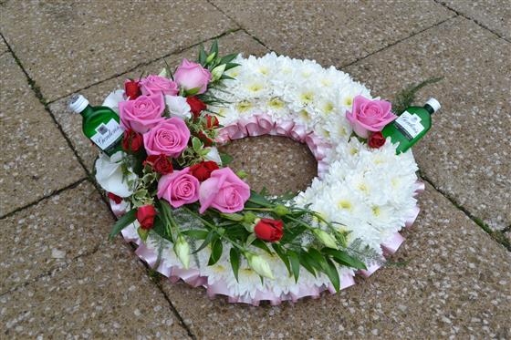 A lovely example of how we can personalise a tribute. In this classic wreath we added at the customers request, two miniature bottles of gin to remember good times past! The wreath is based in white with a pink and white spray and finished with a pink ribbon trim.