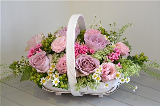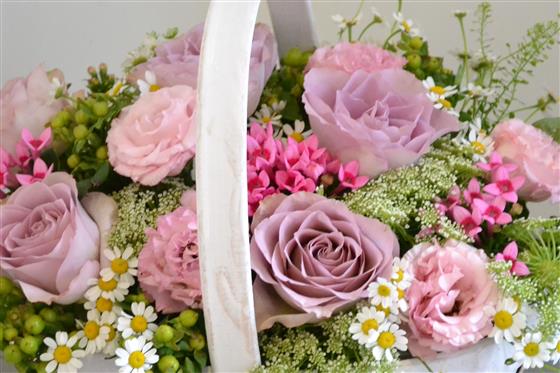 A pretty and feminine basket arrangement filled with lilac roses, pink lisianthus and seasonal flowers in a simple white trug basket.