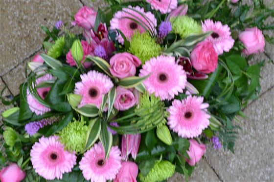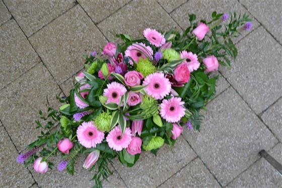 A selection of pink rose are arranged with pink gerbera and Oriental Lily plus a selection of foliage to create this beautiful casket spray. The picture shows the 4ft spray.