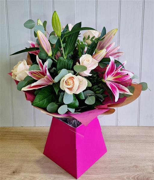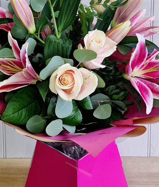 This classic arrangement of lilies and roses exudes grace and sophistication. This exquisite hand tied features soft blush roses paired with vibrant pink lilies, elegantly complemented by lush greenery for a touch of freshness. Beautifully presented in a stylish pink gift box, this bouquet makes a luxurious statement. whether you're celebrating love, appreciation, or just brightening someone's day.