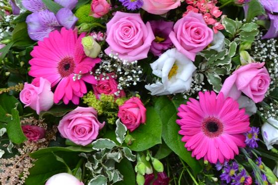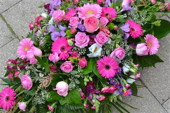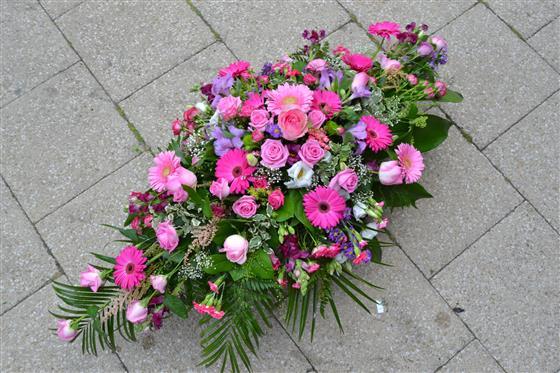 This bright casket spray featuring a classic selection of flowers in pink and lilac includes large-headed Rose, carnations and gerbera complemented by luxurious foliage.