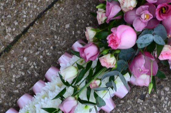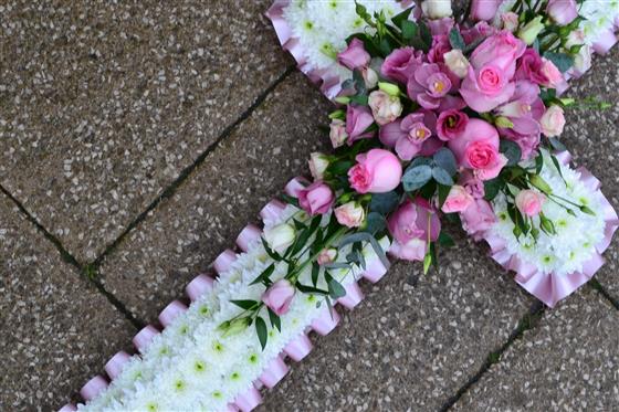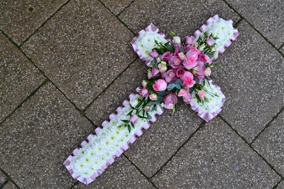 This classic cross is covered with a mass of white Spray Chrysanthemums and has a pink pleated ribbon edge. A spray of pink roses, pink lisianthus, pink seasonal flower and lovely foliage completes this traditional design. Photo depicts 3ft size approximate length.