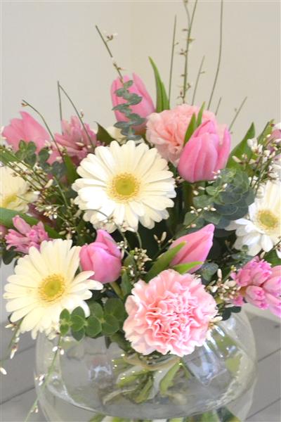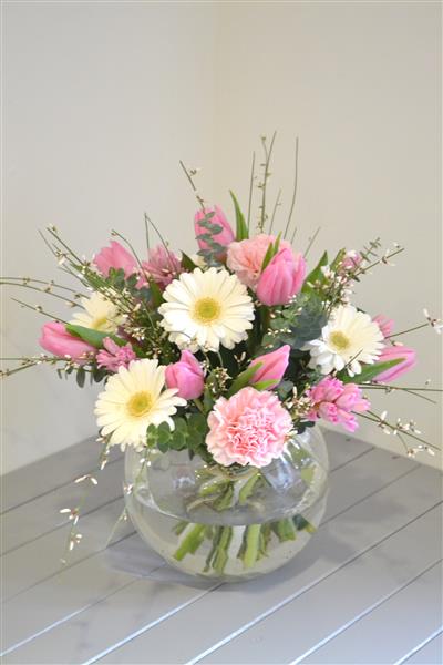 A pretty, delicate and feminine design of pink and white flowers including white gerberas, tulips, long-lasting carnations and scented hyacinth. All arranged in a clear glass globe which makes a lovely centrepiece, ready for instant display. Photo depicts standard size.