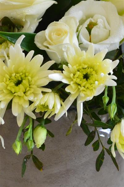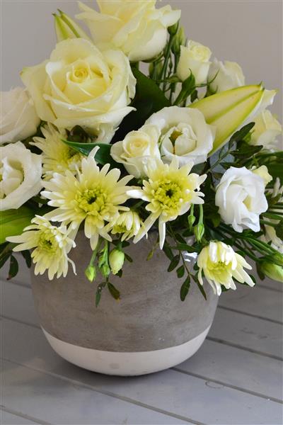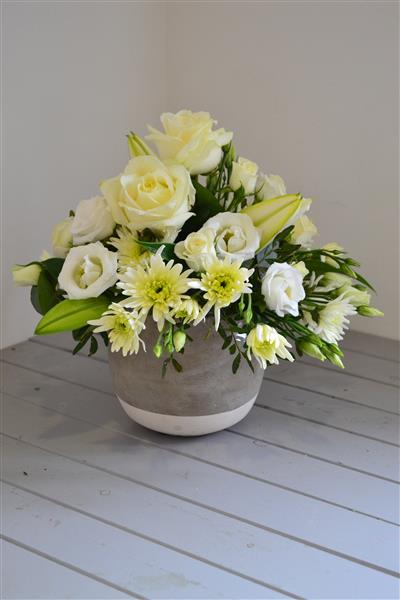 A classic collection of white flowers including lily, lisianthus, chrysanthemums, roses and complementary foliage all perfectly arrnged in a contemporary soft grey concrete pot with natural base.