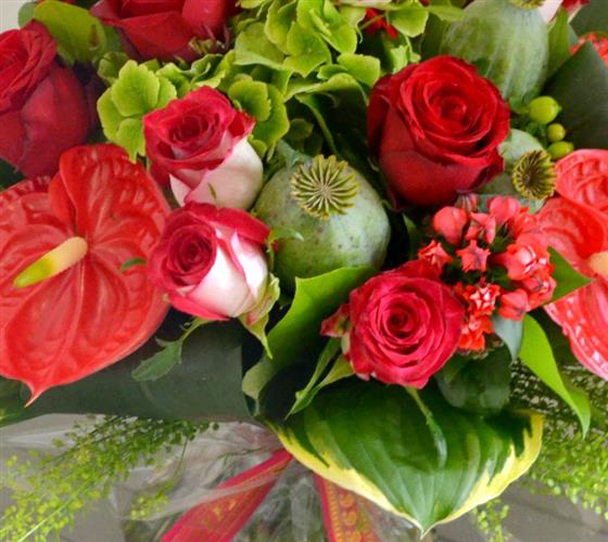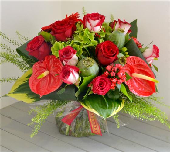 A sumptious handtied bouquet including large headed red Naomi roses and red anthurium accented with seasomal foliage and filler flowers. Photo depicts standard size.