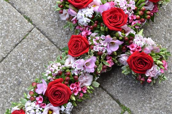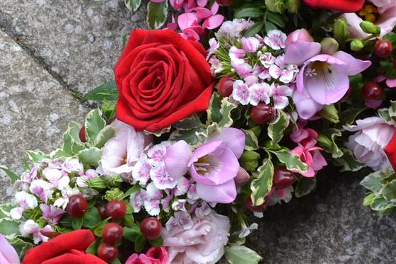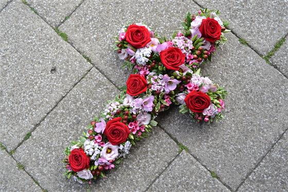 A natural, garden design on a 2' cross (60cm)covered with a mass of flowers including red roses and pink freesia.