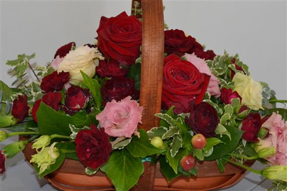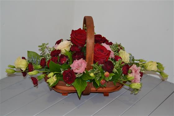 A lovely gift, especially for an occasion which calls for red, such as a Ruby wedding anniversary or a similarly romantic gesture. This trug basket has been filled with large headed red roses, spray roses and pretty pink lisianthus. All ready for instant display!