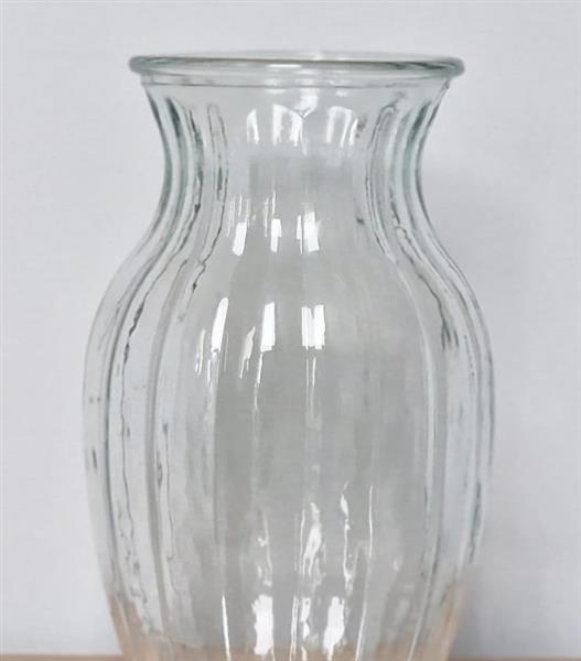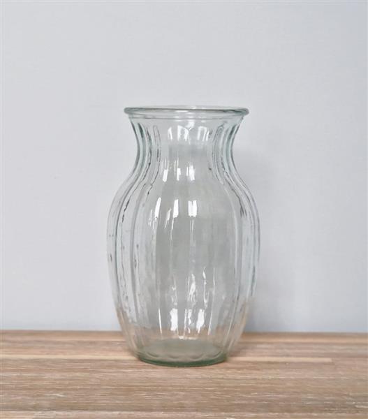Ribbed glass vase. Approximately 18.5cm in height and neck opening of 9cm.