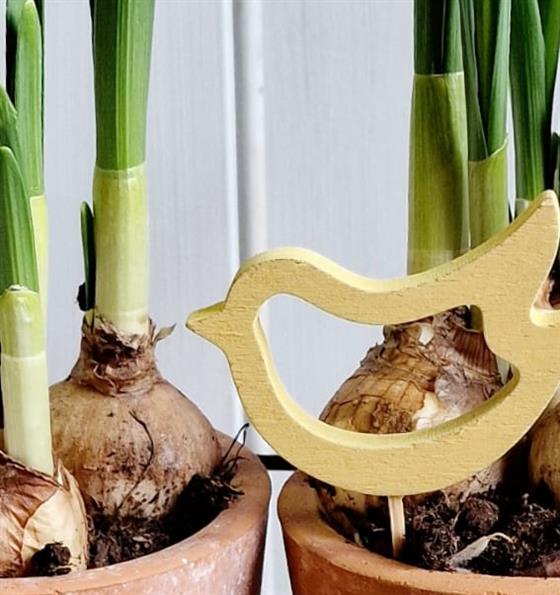 Welcome the beauty of spring into your home with this charming spring bulb arrangement in classic terracotta pots. These early-blooming bulbs are nestled in natural clay pots, sitting within a rustic metal frame for a farmhouse-inspired look. A wooden bird decoration adds a whimsical touch, while the handwritten tag reminds you to provide light, water, and love.