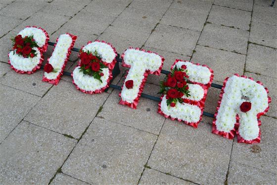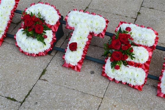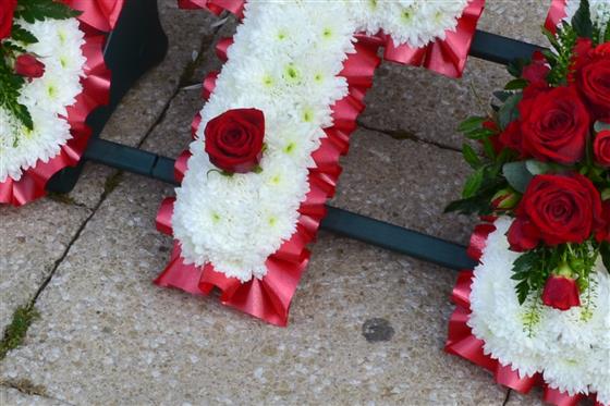 A very personel tribute, edged in red ribbon with white chrysanthemum base and red flower clusters including roses. other colour options available.